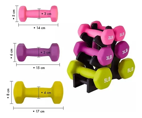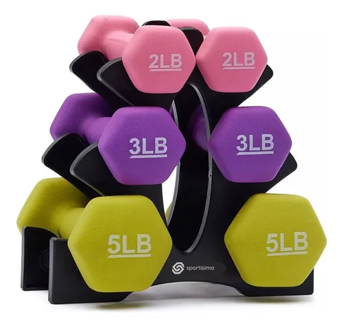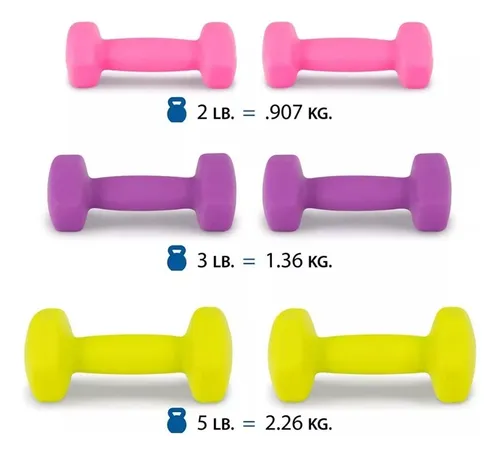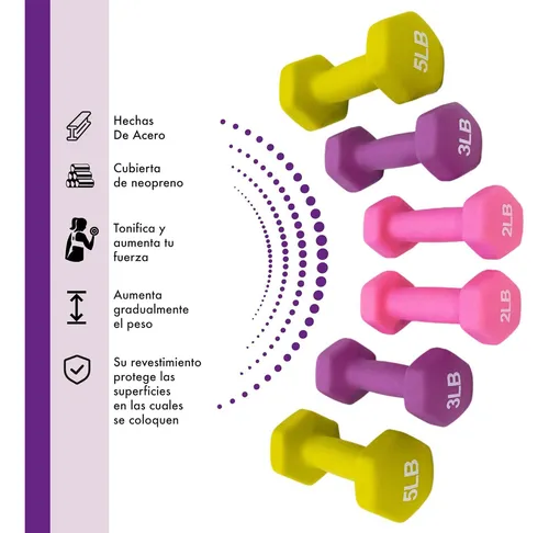 El kit incluye tres pares de mancuernas, con pesos de 2, 3 y 5 libras respectivamente, lo que las hace ideales tanto para principiantes como para personas que buscan variar la intensidad de sus entrenamientos.